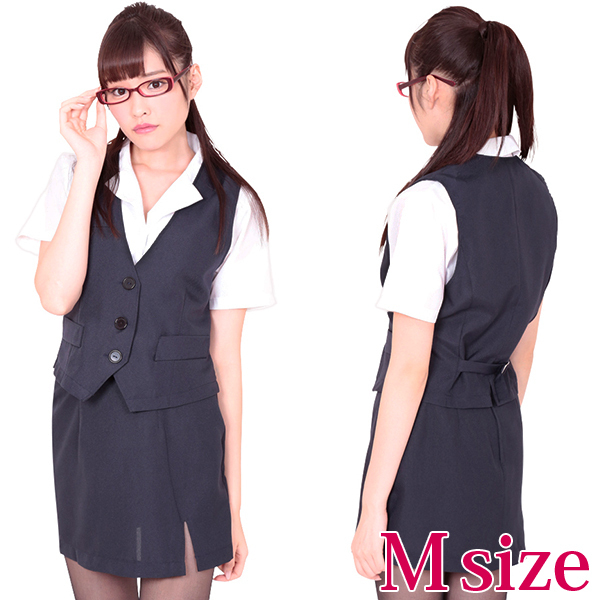 落ち着いた紺色が清楚な秘書の雰囲気を演出!セクシーな胸元の半袖ブラウスとミニスカート、3つボタンベストのなりきりコスプレ3点セットで魅力的なOLに変身しちゃおう!