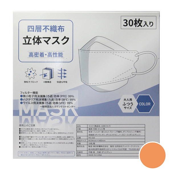 風邪・花粉・ウイルス対策に♪四層不織布立体マスク(アプリコット)の30枚入りです!大人用の普通サイズで高性能四層不織布立体マスク!微小粒子飛沫捕集率(ろ過)効果(PFE)99%。