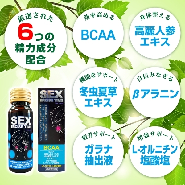 心身ともに自分を高めたい貴男のためのサポートドリンクです♪業界初のコンセプトである「セクササイズ」を実現しました! BCAA、高麗人参エキス、冬虫夏草、βアラニン、ガラナ抽出液、L−オルニチン塩酸塩の6つの厳選成分を配合しています♪理想の自分になりたい方にぴったりのドリンクです!悩みと真剣に向き合いたい方、今の自分に負けたくない方にもおすすめです。