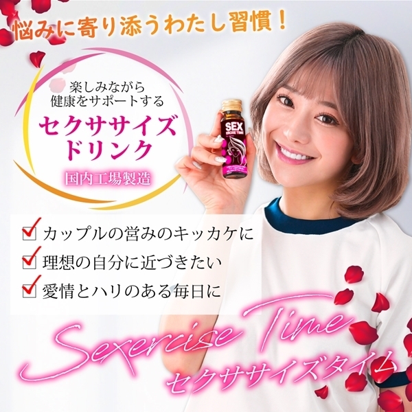 心身ともに自分を高めたい貴女のためのサポートドリンクです♪業界初の「セクササイズ」を実現しました!黒ショウガエキス末、マカエキス末、ムクナエキス末、L−カルニチンフマル酸塩の4つの厳選成分を配合しています♪毎日にメリハリをつけたい方にぴったりのドリンクです!悩みに向き合いたい方、理想の自分に近づきたい方にもおすすめ♪SEXERCISE TIMEは、身も心もスッキリとした充実した日々を目指し、愛情とハリのある毎日へと導きます。
