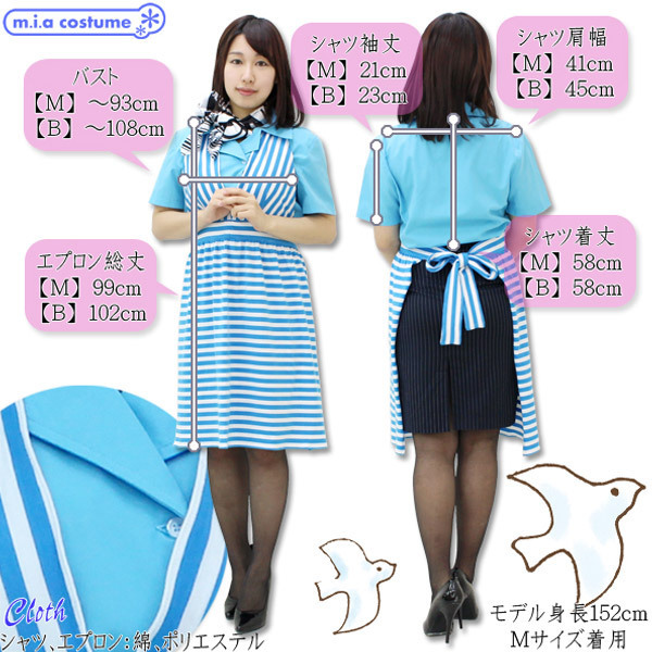 ◆コスチューム ◆/NT3003B ◆Bサイズ シャツ:B〜108cm・肩幅45cm・袖丈23cm・着丈58cm ジャケット:B〜104cm・肩幅46cm・袖丈59cm・着丈57cm スカート:W〜88cm・H〜102cm・着丈57cm エプロン:総丈102cm スカーフ:89×89cm セット内容:シャツ、ジャケット、スカート、エプロン、スカーフ