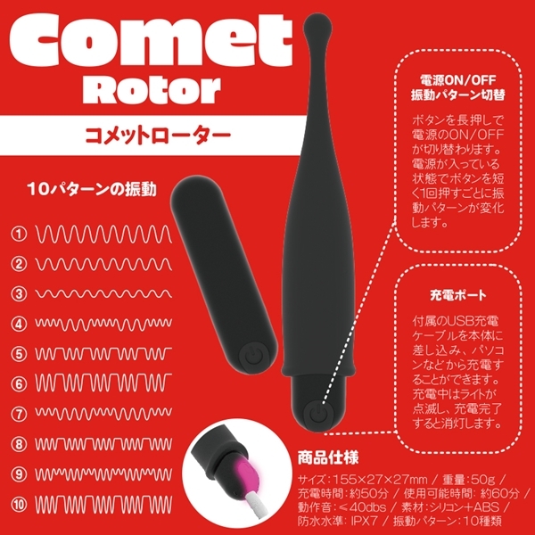 初心者でも扱いやすいピンポイントローターです♪ヘッド部分には肌触りの良いシリコン素材を使用し、小型ながらもパワフルな刺激をお届けします!狙ったポイントを的確に刺激できるピンポイントモードと、シリコンヘッドを外して使用するノーマルモードの2WAY仕様♪ワンボタンで簡単に操作でき、10種類の振動パターンからお好みの刺激を選べます!IPX7等級の完全防水なので、お風呂などでも使用可能です♪