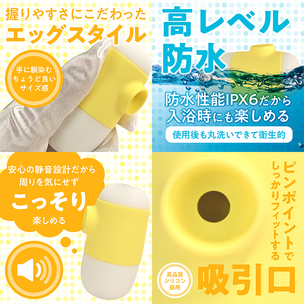 手にフィットするエッグスタイルの吸引ローターです♪可愛らしいデザインに、高性能な静音モーターを搭載しています!タマゴ型フォルムの上部にボタンを配置し、片手でもスムーズに操作可能です♪吸引口には柔らかく高品質なシリコン素材を採用し、ピンポイントにしっかりフィットして快適な真空状態を演出!7パターンの吸引アクションを搭載しており、強弱の調整も自在に楽しめます♪約120分で満充電でき、最大約90分間の連続使用が可能!(使用環境により変動します!)さらにIPX8相当の高い防水性能を備えているため、使用後も丸洗いできて衛生的です♪コンパクトながら多機能な、使いやすさにこだわったアイテムです!