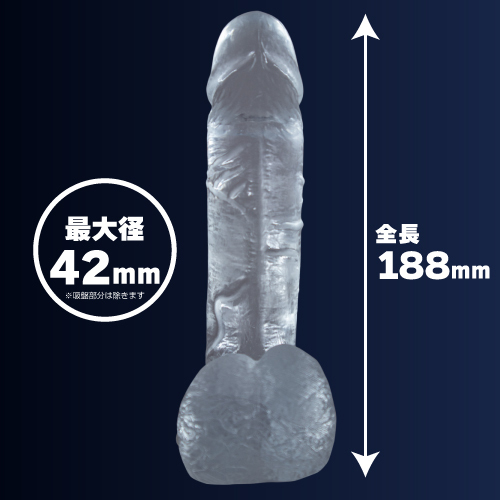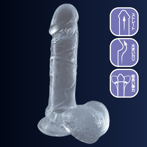 ストレート形状で大きなカリ、そして程よい弾力が特徴で、平均的な日本人サイズのペニスでは体験できない快感が味わえるのが自慢です♪太く、まっすぐ向き合う太い俺!透明ディルドで吸盤付きで、挿入感がたまらないので太さと大きさを求めている方におすすめです♪