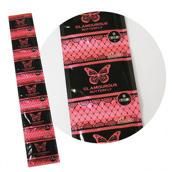 先端にマリンコラーゲン、ヒアルロン酸配合の潤いゼリー付き!流行に敏感なティーン世代の女の子達が「女性たち自身が欲しくなるコンドーム」をコンセプトに作ったお洒落コンドーム「グラマラスバタフライモイスト1000」12個入。