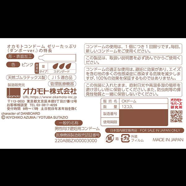 可愛いパッケージが印象的で女性でも手に取りやすいのが嬉しいポイント♪潤滑ゼリーが「オカモトコンドーム(ダンボーver)」に比べて250%に増量し、オカモトコンドームゼリーがたっぷりでより滑らかな使い心地を実感していただけます。